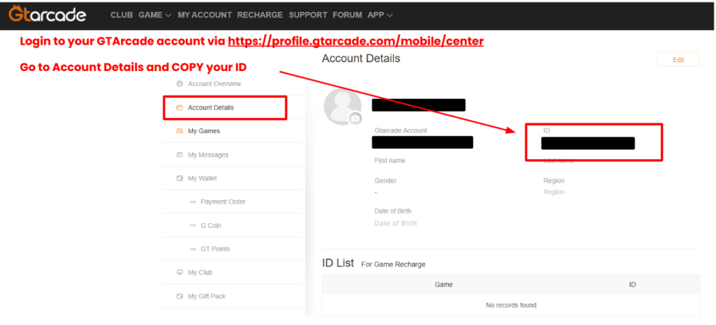 Login to your GTArcade account via https://profile.gtarcade.com/mobile/center then go to account details and copy your ID.